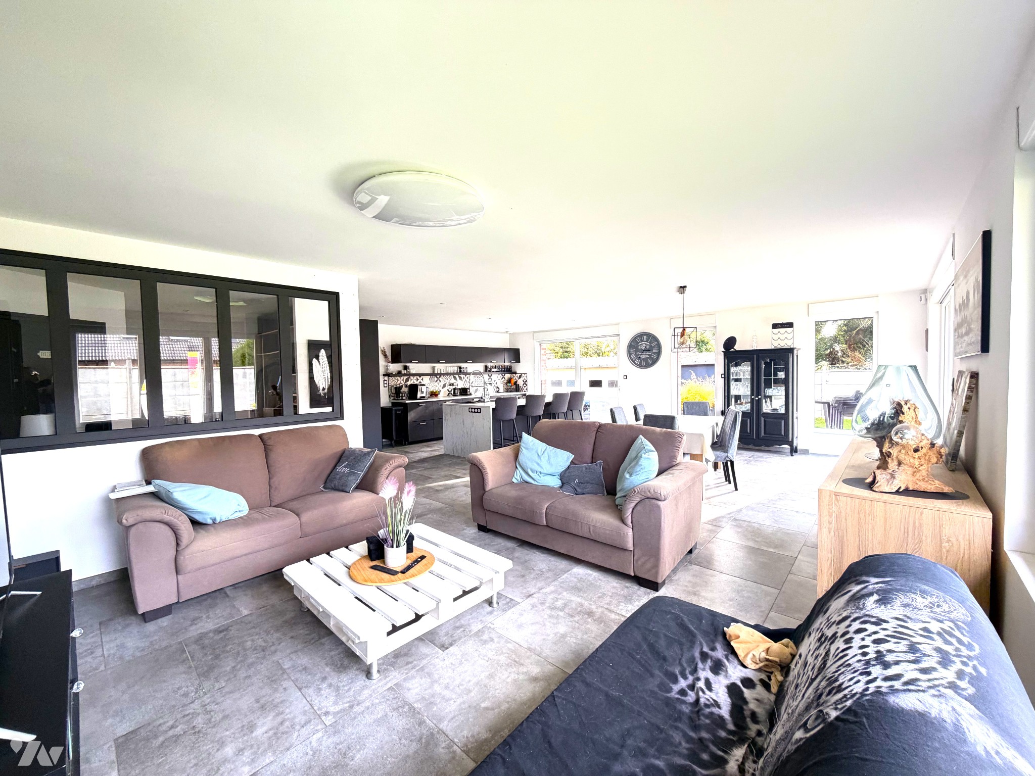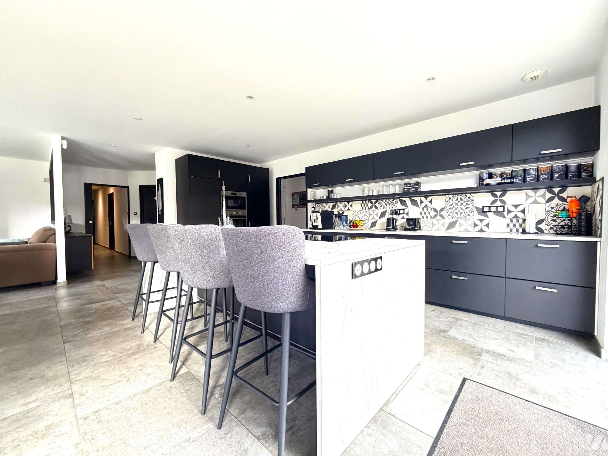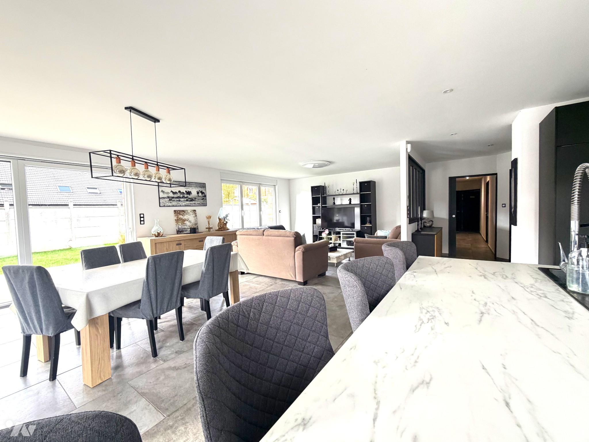Une cuisine aménagée et équipée avec îlot central, ouverte sur un vaste séjour et un salon lumineux
