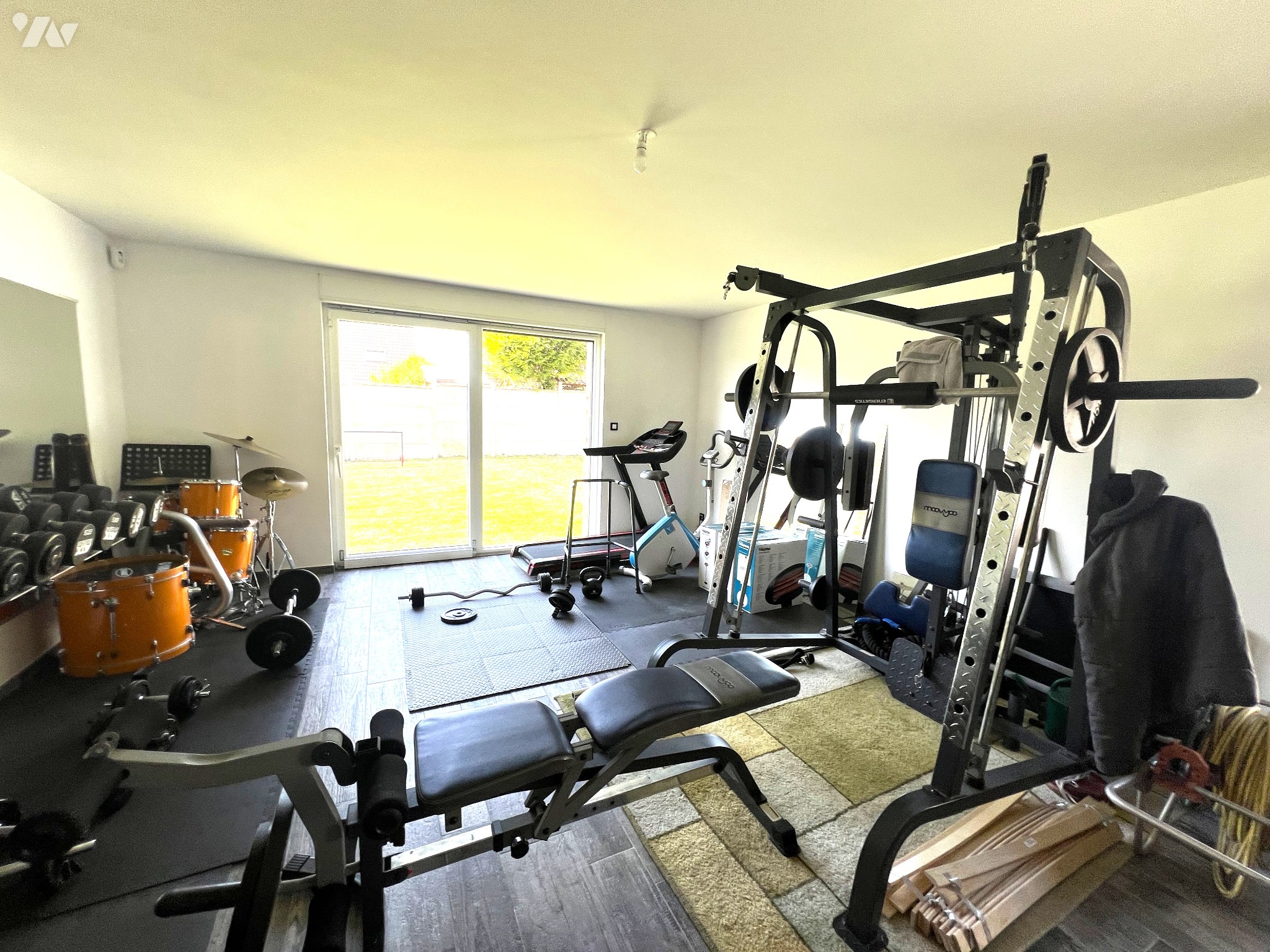 Une grande pièce pouvant servir de chambre ou de salle de sport.